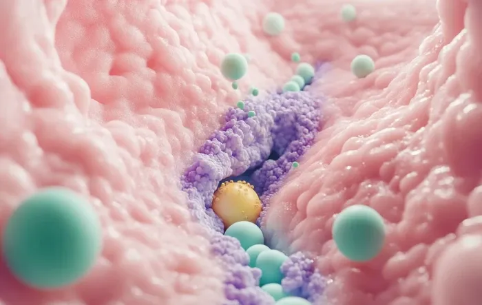 Next, the chyme moves to the small intestine, which is the main area for nutrient absorption. Here, enzymes and bile from the liver and pancreas help break down fats, proteins, and carbohydrates into tiny molecules your body can absorb into the bloodstream1. The small intestine is also home to a large part of your microbiome—your helpful gut bacteria that aid in digestion and nutrient absorption2,3.